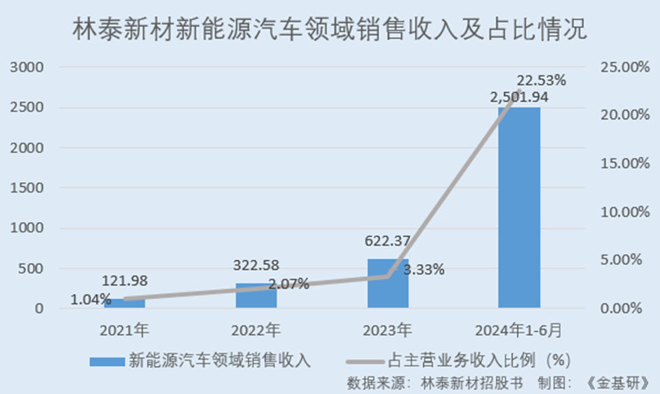 據(jù)招股書,2021-2023年及2024年1-6月,林泰新材新能源汽車領(lǐng)域銷售收入分別為121.98萬元、322.58萬元、622.37萬元、2,501.94萬元,占主營業(yè)務(wù)收入比例分別為1.04%、2.07%、3.33%、22.53%。2024年上半年,林泰新材在新能源汽車領(lǐng)域的銷售快速增長,體現(xiàn)出其在新能源汽車領(lǐng)域的強(qiáng)勁增長動(dòng)能和良好發(fā)展前景。