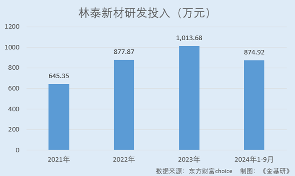 2021-2023年及2024年1-9月,林泰新材研發(fā)投入分別為645.35萬元、877.87萬元、1,013.68萬元、874.92萬元。其中,林泰新材2024年1-9月研發(fā)投入同比增長18.87%。