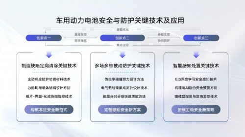 “車用動(dòng)力電池安全與防護(hù)關(guān)鍵技術(shù)及應(yīng)用”項(xiàng)目,通過在本征安全、被動(dòng)安全、主動(dòng)安全三個(gè)層面,構(gòu)建“電芯-系統(tǒng)-端云協(xié)同診斷”的全方位安全保障體系,實(shí)現(xiàn)了“電芯設(shè)計(jì)好、制造好、系統(tǒng)防護(hù)好、整車預(yù)警好”的創(chuàng)新突破設(shè)計(jì),盡展標(biāo)桿實(shí)力。