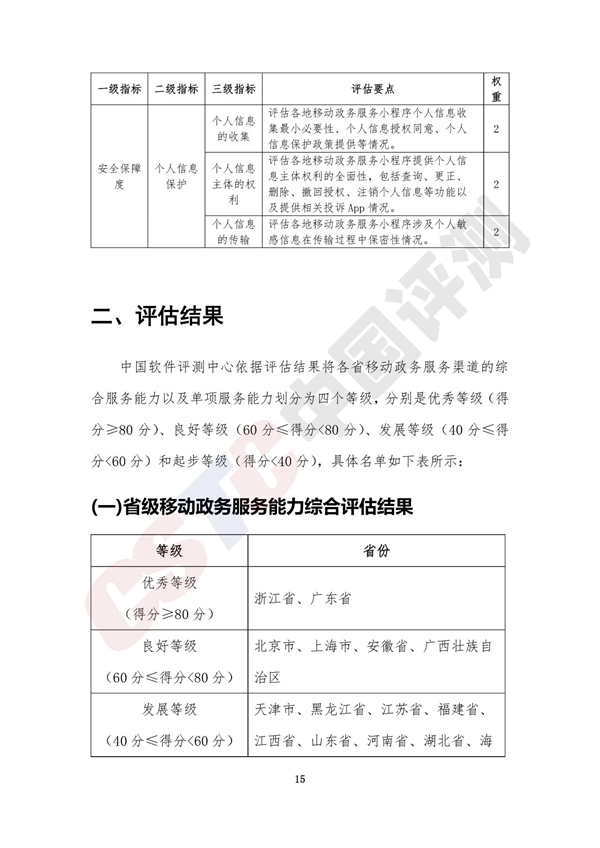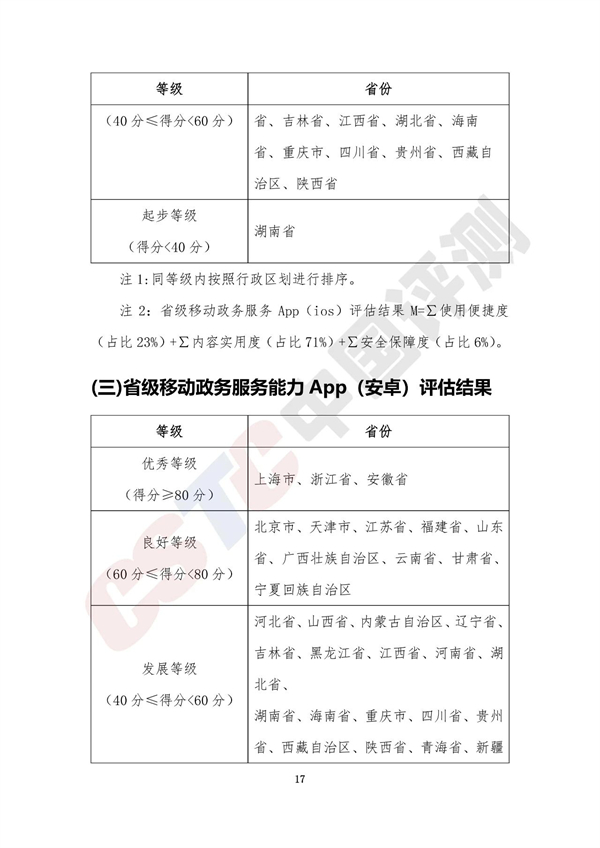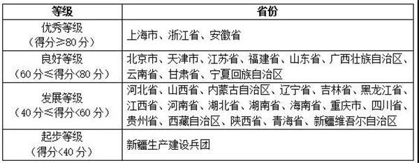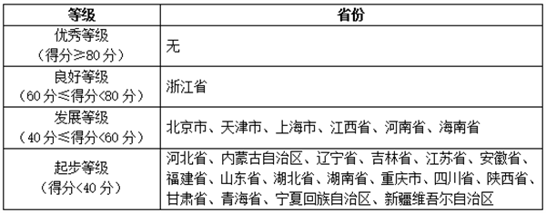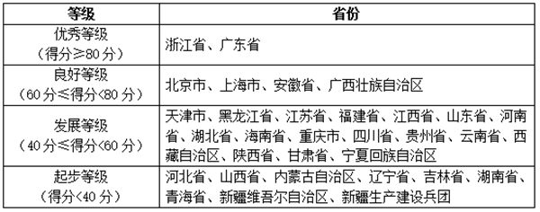 報(bào)告將各省移動(dòng)政務(wù)服務(wù)渠道的綜合服務(wù)能力以及單項(xiàng)服務(wù)能力劃分為四個(gè)等級(jí),分別是優(yōu)秀等級(jí)(得分≥80分)、良好等級(jí)(60分≤得分<80分)、發(fā)展等級(jí)(40分≤得分<60分)和起步等級(jí)(得分<40分),具體名單如下表所示: