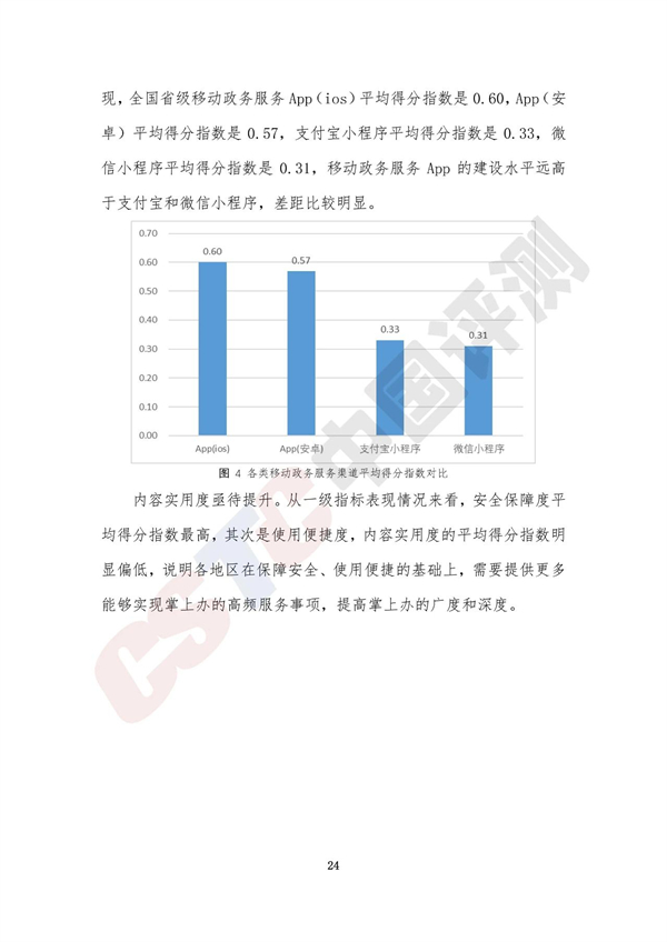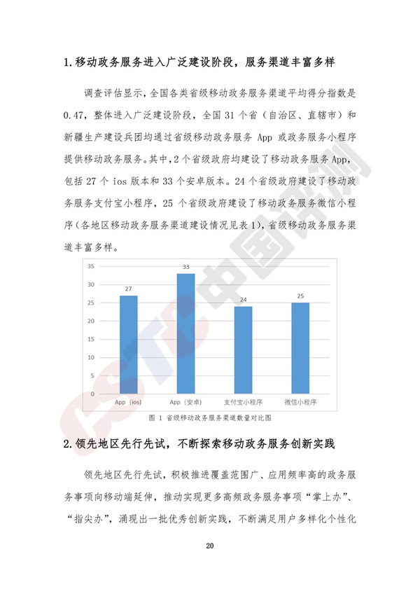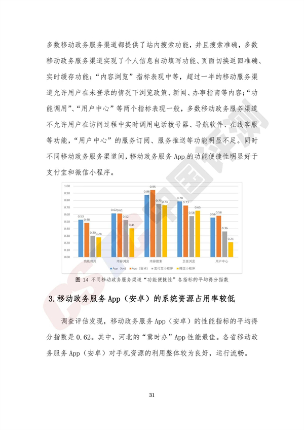 調(diào)查評(píng)估顯示,全國(guó)各類省級(jí)移動(dòng)政務(wù)服務(wù)渠道平均得分指數(shù)是0.47,整體進(jìn)入廣泛建設(shè)階段,全國(guó)31個(gè)省(自治區(qū)、直轄市)和新疆生產(chǎn)建設(shè)兵團(tuán)均通過(guò)省級(jí)移動(dòng)政務(wù)服務(wù)App或政務(wù)服務(wù)小程序提供移動(dòng)政務(wù)服務(wù)。