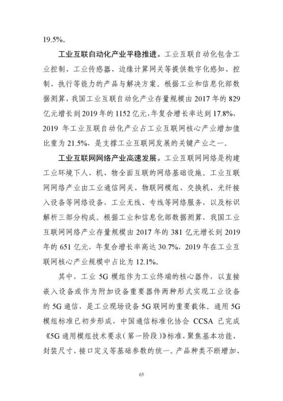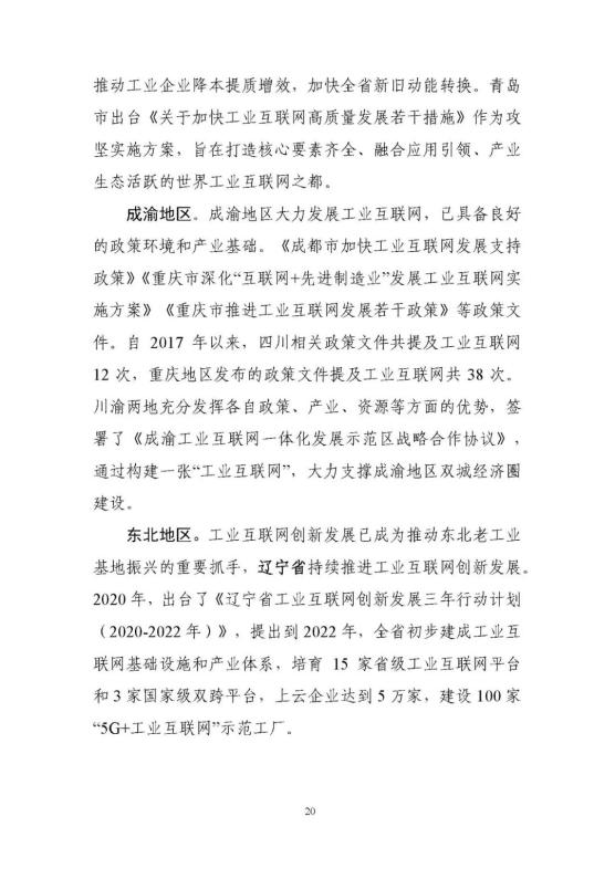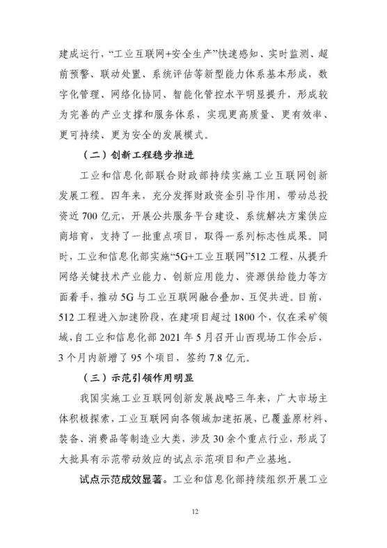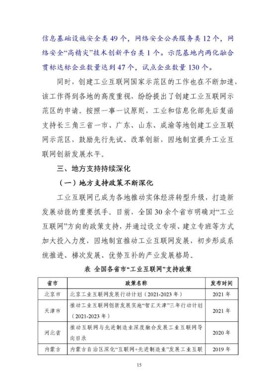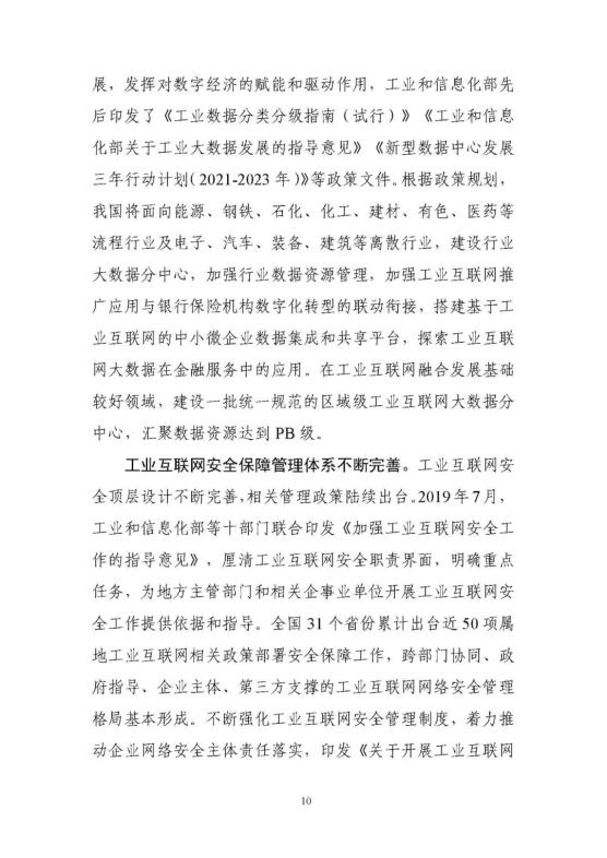 從上到下,政策環(huán)境持續(xù)優(yōu)化。2017年《關于深化“互聯(lián)網(wǎng)﹢先進制造業(yè)”發(fā)展工業(yè)互聯(lián)網(wǎng)的指導意見》正式發(fā)布,在工業(yè)互聯(lián)網(wǎng)專項工作組的統(tǒng)籌協(xié)調和大力推動下,實施20182020年工業(yè)互聯(lián)網(wǎng)三年行動計劃。今年年初,工信部又發(fā)布了2021-2023年工業(yè)互聯(lián)網(wǎng)三年行動計劃,聚焦基礎設施、融合應用、技術創(chuàng)新、產(chǎn)業(yè)生態(tài)、安全保障五大方面重點任務,部署了11個重點行動和10個重點工程。工信部先后出臺11項政策,針對性推動網(wǎng)絡、平臺、數(shù)據(jù)、安全四大領域重點工作。地方支持力度不斷加大,各具特色的地方政策有效覆蓋全國31個?。▍^(qū)、市)。實施工業(yè)互聯(lián)網(wǎng)創(chuàng)新發(fā)展工程,帶動總投資近700億元,建設了一大批公共服務平臺,形成了一大批具有標桿效應的試點示范項目,建設了多個“5G﹢工業(yè)互聯(lián)網(wǎng)”產(chǎn)業(yè)示范基地。