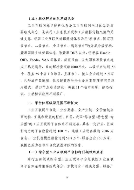 從無到有,四大體系建設取得突破性進展。在市場推動和政策指引下,網(wǎng)絡體系建設邁上了新臺階,高質量的外網(wǎng)建設覆蓋全國300多個地市,連接工業(yè)企業(yè)18萬家。TSN、5G等新型網(wǎng)絡技術推動企業(yè)內網(wǎng)改造力度不斷加大。工業(yè)互聯(lián)網(wǎng)標識解析實現(xiàn)了從0到1的跨越,五大頂級節(jié)點建成并穩(wěn)定運行,標識注冊量突破400億。平臺體系建設取得積極進展,15個雙跨平臺引領示范作用日益顯著,具有一定行業(yè)區(qū)域影響力的工業(yè)互聯(lián)網(wǎng)平臺超過100家,服務企業(yè)超160萬家,同時平臺連接的重要工業(yè)設備已經(jīng)超過7600萬臺/套。數(shù)據(jù)體系建設取得了積極成效,從規(guī)劃建設到落地推動,全國一盤棋的國家工業(yè)互聯(lián)網(wǎng)大數(shù)據(jù)體系正在匯聚成形,大數(shù)據(jù)中心體系覆蓋企業(yè)已經(jīng)超700萬家。安全體系建設快速推進,威脅監(jiān)測和信息通報的處置不斷強化,企業(yè)安全的主體責任意識逐步增強,國家、省、企業(yè)三級聯(lián)動的技術監(jiān)測體系在全國推廣。
