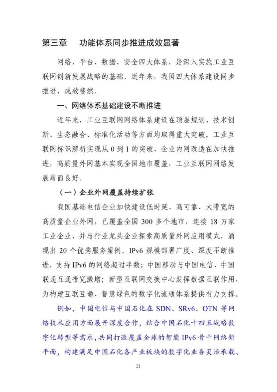 10月18日,在2021全球工業(yè)互聯(lián)網(wǎng)大會上,中國工業(yè)互聯(lián)網(wǎng)研究院院長魯春叢發(fā)布了《工業(yè)互聯(lián)網(wǎng)創(chuàng)新發(fā)展成效報告(20182021年)》(以下簡稱《報告》)?!秷蟾妗分赋觯怨I(yè)互聯(lián)網(wǎng)創(chuàng)新發(fā)展戰(zhàn)略實施以來,我國工業(yè)互聯(lián)網(wǎng)創(chuàng)新發(fā)展戰(zhàn)略穩(wěn)步推進,三年行動計劃全部完成,部分重點任務和工程超出預期,網(wǎng)絡基礎、平臺中樞、數(shù)據(jù)要素、安全保障作用進一步顯現(xiàn)。