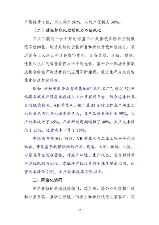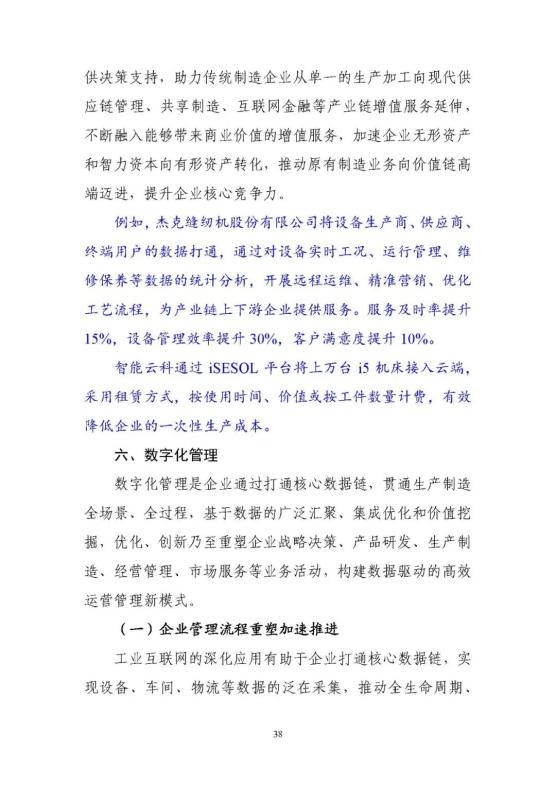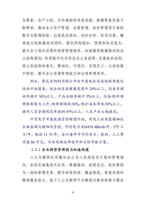 從點到面,融合應用新動能快速壯大。工業(yè)互聯(lián)網(wǎng)的應用從龍頭企業(yè)內部拓展到產(chǎn)業(yè)鏈上下游,正在推動形成大中小企業(yè)融通創(chuàng)新的新格局,應用的范圍覆蓋了鋼鐵、機械、電力、交通、能源等40多個國民經(jīng)濟重點行業(yè)。工業(yè)互聯(lián)網(wǎng)應用正在從研產(chǎn)供銷服務各個環(huán)節(jié),向全環(huán)節(jié)、全流程綜合集成應用和多領域系統(tǒng)創(chuàng)新延伸,形成了平臺化設計、智能化制造、網(wǎng)絡化協(xié)同、個性化定制、數(shù)字化管理等六大典型模式,有效支撐了我國制造業(yè)高端化、智能化、綠色化發(fā)展。