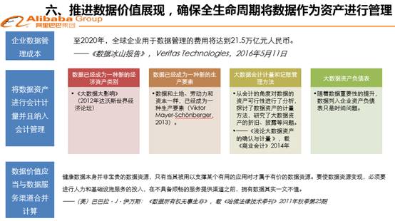 第六個方面,供大家思考的問題是數(shù)據(jù)管理。因為數(shù)據(jù)有價,所以要進(jìn)行管理。世界各國,特別是美國很早提出來對數(shù)據(jù)全生命周期按照資產(chǎn)進(jìn)行管理。這個理念很先進(jìn),在今天互聯(lián)網(wǎng)時代也很合適,行業(yè)、企業(yè)和政府機(jī)構(gòu),擁有數(shù)據(jù)庫的,是不是應(yīng)當(dāng)肩負(fù)使命,把數(shù)據(jù)作為資產(chǎn)在全生命周期管理起來。甚至有一些比較激進(jìn)的學(xué)者提出將數(shù)據(jù)納入資產(chǎn)負(fù)債表來進(jìn)行管理,這種觀念同時提出數(shù)據(jù)會計計賬模型、數(shù)據(jù)會計準(zhǔn)則等可操作的方法和模型。這種做法和秉承的理念,也對我們是有啟發(fā)意義的,至少能夠說明數(shù)據(jù)是有價值的,至于采取會計方式還是采取其它非會計方式來進(jìn)行管理,這都可以討論。