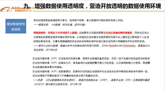 第九個方面,數(shù)據(jù)使用透明度問題。第九個方面,建議增強(qiáng)數(shù)據(jù)使用透明度,營造開放透明的數(shù)據(jù)使用環(huán)境。企業(yè)要通過各種政策宣示和實際行動,增強(qiáng)其數(shù)據(jù)使用的透明度,增加用戶對自己數(shù)據(jù)控制方的信任度。