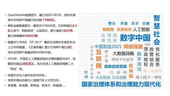 通過這樣一組數(shù)據(jù),我們也可以看到近幾年在人工智能、共享經(jīng)濟、公益方面出現(xiàn)了很多值得關注的變化。生產(chǎn)關系和社會關系實際上也在經(jīng)歷著數(shù)字化洗禮、網(wǎng)絡化重塑和分權化再造,這種情況下我們政府治理模式也進入了新的歷史階段。