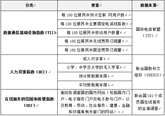 EGDI是電子政務(wù)三個(gè)重要維度上三項(xiàng)標(biāo)準(zhǔn)指數(shù)的加權(quán)平均數(shù),包括數(shù)據(jù)通信基礎(chǔ)設(shè)施指數(shù)(TII)、人力資源指數(shù)(HCI)和在線服務(wù)的范圍和質(zhì)量指數(shù)(OSI),各維度的具體評價(jià)要素如表1所示。