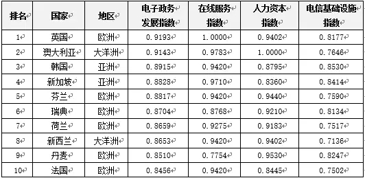 全球電子政務(wù)方面,歐洲繼續(xù)保持領(lǐng)先,2016年全球電子政務(wù)排名中,前10名中歐洲國家占據(jù)6席。其中英國以EGDI值0.9193居于全球第一名,澳大利亞以微弱差距居于第二名(EGDI值為0.9143),韓國、新加坡、芬蘭等國家也居于前列。