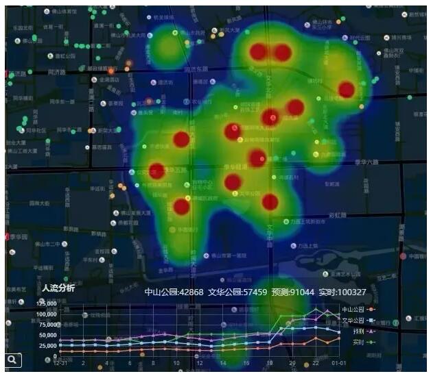第三是預(yù)判用數(shù)據(jù)說話,依托大數(shù)據(jù)分析能力增強(qiáng)工作的針對(duì)性和精確性。佛山有一個(gè)新年倒計(jì)時(shí)活動(dòng),我們跟三大運(yùn)營(yíng)商的手機(jī)實(shí)時(shí)信息對(duì)接,監(jiān)控人流密度,當(dāng)超過某一個(gè)值的,發(fā)現(xiàn)預(yù)警對(duì)人流進(jìn)行實(shí)時(shí)疏散。下圖是演示疏散情況,紅色的點(diǎn)是新年倒計(jì)時(shí)活動(dòng)人流量最多的區(qū)域,我們?cè)谌肆髁孔疃嗟牡胤阶隽艘粋€(gè)疏散的區(qū)域,及時(shí)進(jìn)行疏散。