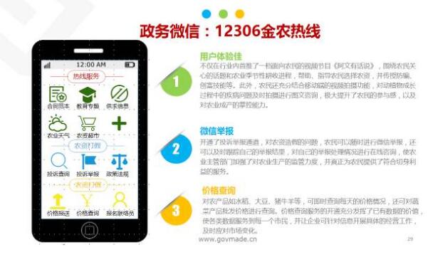 首先介紹12306金農熱線,它整個應用的功能不止這三個,它的功能有幾十個入口,但是里面就有這么幾個入口。第一個是他們通過APP推了一個欄目,這個欄目是《阿文有話說》,通過這個欄目就可以進行融資,防范受騙,相當于是把信息轉化成了精品內容。第二個是基于農民老是會買到假種子,用戶關注度比較高的區(qū)域他設立了一個舉報的途徑。第三個是價格查詢,每天包括水稻、肉類的價格可以實時查詢到。