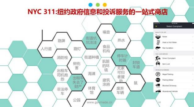 國外的案例包括紐約的政府信息和投訴服務的一站式商店,不管是老鼠太多了,還是下水道里面有噪音,都可以給你提供一個入口和分類,大家就根據你的入口提供一些建議和投訴統(tǒng)一給他進行反饋。