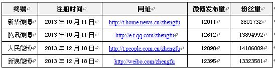 2013年10月開始,國務(wù)院官方微博分別在新華微博、人民微博、騰訊微博、新浪微博四大主體微博平臺上線,官方微信也同期推出,成為發(fā)布國務(wù)院領(lǐng)導(dǎo)同志政務(wù)活動信息、國務(wù)院重要會議信息、國務(wù)院和國務(wù)院辦公廳公開發(fā)布的政策文件及解讀稿件等政務(wù)信息的新媒體渠道。微博微信的推出拉近了中南海和普通民眾的距離,進一步提升了政府的透明度和公信力。