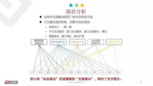 2006年,在國(guó)家信息化領(lǐng)導(dǎo)小組發(fā)布的國(guó)家電子政務(wù)總體框架中,把政務(wù)信息資源目錄體系交換體系定位為國(guó)家電子政務(wù)總體框架的基礎(chǔ)設(shè)施,提出說(shuō)政務(wù)信息資源開(kāi)發(fā)利用是電子政務(wù)建設(shè)的核心,要實(shí)現(xiàn)這種橫向信息資源的橫向共享和縱向匯聚,要逐步實(shí)現(xiàn)政務(wù)信息按需共享。