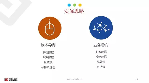 第二個(gè)就說(shuō)實(shí)施的思路。那現(xiàn)在我們?cè)谄渌胤阶龅倪^(guò)程中發(fā)現(xiàn)目前主要有兩種思路,一個(gè)是技術(shù)導(dǎo)向去做,第二個(gè)是業(yè)務(wù)導(dǎo)向去做。技術(shù)導(dǎo)向就是與部門(mén)核心業(yè)務(wù)或者說(shuō)數(shù)據(jù)相關(guān)的一切的以系統(tǒng)和數(shù)據(jù)庫(kù)去入手。那首先在通過(guò)這個(gè)系統(tǒng)數(shù)據(jù),我們?cè)偃サ雇七@個(gè)系統(tǒng)數(shù)據(jù)由哪個(gè)業(yè)務(wù)數(shù)據(jù)產(chǎn)生的。這樣技術(shù)導(dǎo)向去做有一個(gè)好處就是見(jiàn)效快。因?yàn)檫@個(gè)數(shù)據(jù),都是已經(jīng)在系統(tǒng)里面的是可以很快拿到的。但是它的可持續(xù)性差,因?yàn)橛行I(yè)務(wù)可能是還沒(méi)有形成應(yīng)用系統(tǒng),可能現(xiàn)在是人工或者紙制的手段在操作的,那未來(lái)他有這種應(yīng)用系統(tǒng)的時(shí)候。那么整個(gè)這一塊可能要去重新梳理或者說(shuō)重新改版。