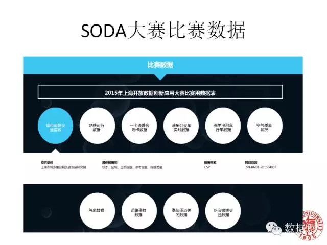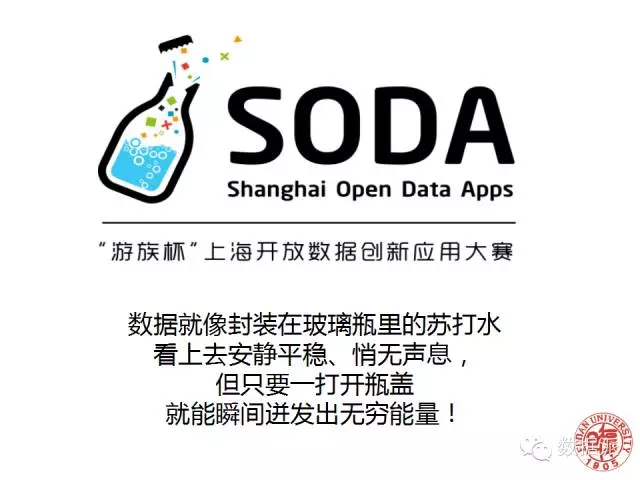 今年上海經(jīng)信委協(xié)調(diào)交通委,一共開(kāi)放了1TB的數(shù)據(jù),也組織了一個(gè)大賽,名稱(chēng)很好玩,叫SODA大賽。當(dāng)我們把Shanghai Open Data Apps這幾個(gè)詞的首字母放在一起的時(shí)候,正好就是SODA,就是蘇打水的意思。這正符合開(kāi)放數(shù)據(jù)的理念。政府的數(shù)據(jù)就像封在瓶子里的蘇打水,關(guān)著瓶蓋的時(shí)候看上去悄無(wú)聲息,但只要你把瓶子一打開(kāi),嘭的一聲,數(shù)據(jù)的能量就迸發(fā)出來(lái)了。這個(gè)瓶子的logo是我當(dāng)天晚上畫(huà)了一個(gè)構(gòu)思草圖發(fā)到組委會(huì)的群里面,后來(lái)專(zhuān)業(yè)的設(shè)計(jì)師給畫(huà)出來(lái)了。在SODA百?gòu)?qiáng)派對(duì)的時(shí)候,真的找來(lái)一個(gè)大瓶的香檳酒,上面寫(xiě)著SODA,嘭的一聲把瓶子打開(kāi),意思就是數(shù)據(jù)開(kāi)放了。