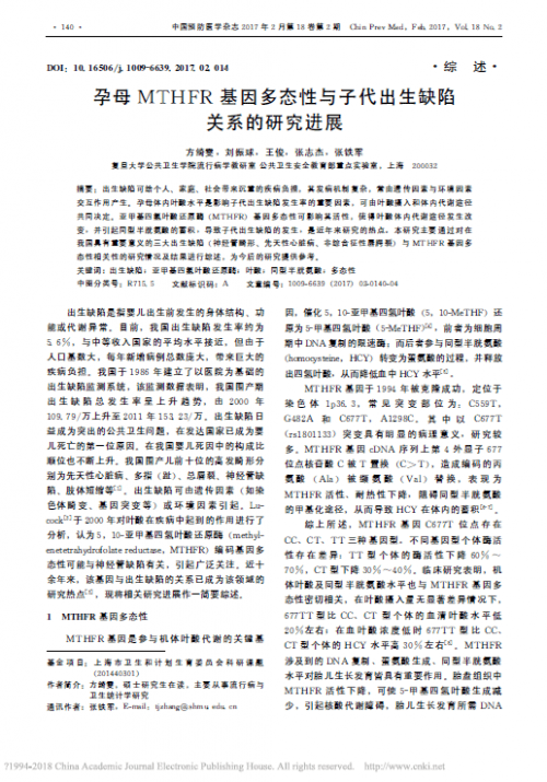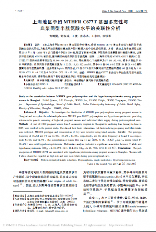 該研究項目成果論文——《上海地區(qū)孕婦MTHFR C677T基因多態(tài)性與血漿同型半胱氨酸水平的關(guān)聯(lián)性分析》已收錄于《中華疾病控制雜志2017年7月第21卷第7期》、論文——《孕母MTHFR基因多態(tài)性與子代出生缺陷關(guān)系的研究進展》收錄于《中國預(yù)防醫(yī)學(xué)雜志2017年2月第18卷第2期》。