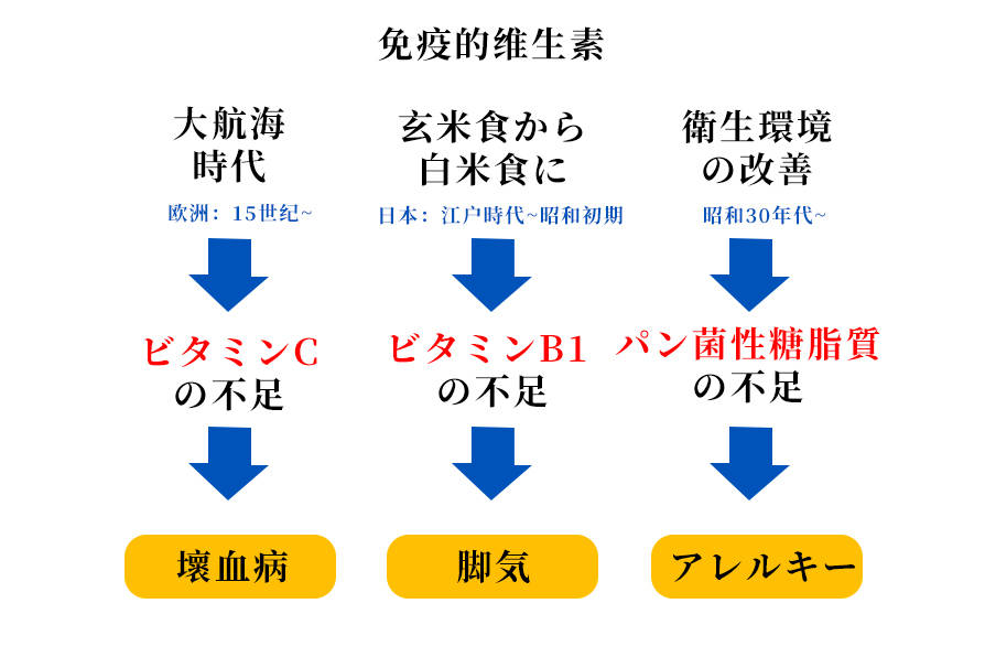 在泛菌糖脂質(zhì)的研究歷史中,由于其在血液中的炎癥作用是眾所周知的,所以泛菌糖脂質(zhì)有內(nèi)毒素的別名。 如果在網(wǎng)上搜索有泛菌糖脂質(zhì)有毒的記載,那就是注射泛菌糖脂質(zhì)的實驗,或者是由于感染被帶入體內(nèi)的情況。 口服泛菌糖脂質(zhì)是沒有毒性的。 即使是日常食用的食品,如果注射的話也會有很多危險物質(zhì),但泛菌糖脂質(zhì)也不是注射的物質(zhì)。 近年來,特別是發(fā)達國家的過敏疾病正在增加,研究表明,這是由于衛(wèi)生環(huán)境的完善導致細菌成分,特別是泛菌糖脂質(zhì)的自然攝取減少的原因( *3)。 像這樣,由于生活環(huán)境和飲食生活的變化,攝取量在不知不覺中減少,有時會產(chǎn)生原因不明的新疾病。 例如,在歐洲的大航海時代,由于漫長的乘船旅行導致蔬菜和水果中維生素c攝取不足,產(chǎn)生了壞血病,在日本,從食用糙米變?yōu)榘酌咨慕瓚魰r代后期開始出現(xiàn)了維生素B1不足,出現(xiàn)了腳氣病。 當時,人們不知道維生素這種物質(zhì)的存在,所以查明原因需要很長時間。 關(guān)于泛菌糖脂質(zhì),作為物質(zhì)雖然是在1892年被發(fā)現(xiàn)的,但是因為不知道其有用性,所以沒想到會因為該物質(zhì)的不足而引起過敏等。 在這一點上,對泛菌糖脂質(zhì)有用性的認知與維生素的發(fā)現(xiàn)有著非常相似的經(jīng)過。
