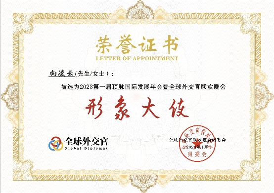 鑒于著名經(jīng)濟(jì)學(xué)家向凌云教授,多年來默默無聞致力服務(wù)全球外交活動(dòng),向多國提供經(jīng)濟(jì)援助并進(jìn)行金融與經(jīng)濟(jì)顧問工作,為多國駐華使館及外交活動(dòng)提供一系列的便利及幫助,為我國的外交活動(dòng)做出了應(yīng)有的貢獻(xiàn)。經(jīng)組委會(huì)一致決定,在2023全球外交官活動(dòng)中授予向凌云“全球外交官形象大使”榮譽(yù)稱號(hào)。