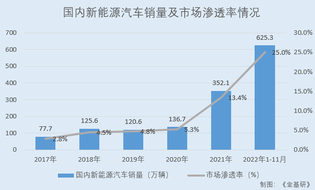 據(jù)中汽協(xié)數(shù)據(jù),2017-2021年及2022年1-11月,國(guó)內(nèi)新能源汽車(chē)銷(xiāo)量分別為77.7萬(wàn)輛、125.6萬(wàn)輛、120.6萬(wàn)輛、136.7萬(wàn)輛、352.1萬(wàn)輛、625.3萬(wàn)輛,市場(chǎng)滲透率分別為2.8%、4.5%、4.8%、5.3%、13.4%、25.0%。