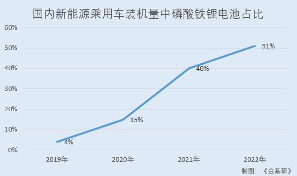 據(jù)高工鋰電統(tǒng)計(jì),2019-2021年,國(guó)內(nèi)新能源乘用車(chē)裝機(jī)量中,三元材料電池裝機(jī)量占比分別為89%、82%、60%,而磷酸鐵鋰電池裝機(jī)量占比分別為4%、15%、40%,磷酸鐵鋰電池占比大幅增長(zhǎng)。2022年1-6月新能源乘用車(chē)裝機(jī)量中,三元材料和磷酸鐵鋰電池裝機(jī)量占比分別為49%和51%,磷酸鐵鋰電池占比超過(guò)三元電池。