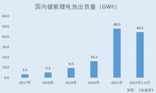 據(jù)高工鋰電數(shù)據(jù),2017-2021年,國(guó)內(nèi)儲(chǔ)能鋰電池的出貨量分別為3.5GWh、5.2GWh、9.5GWh、16.2GWh、48.0GWh,2022年1-6月國(guó)內(nèi)儲(chǔ)能鋰電池出貨量達(dá)44.5GWh,同比增長(zhǎng)超200%。