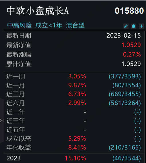 所以最近一些中小盤風格的基金業(yè)績開始跑起來了。中歐基金的基本面量化系列里,有一只去年布局的小盤風格基金的優(yōu)勢很明顯,就是錢亞婷管理的中歐小盤成長。今年以來收益已經(jīng)超15%,從wind統(tǒng)計來看,同類排名里前2%,近6個月、3個月業(yè)績都是名列前茅的。