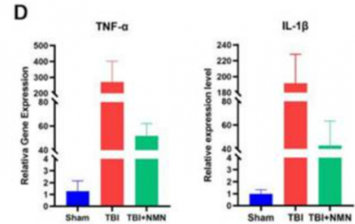 由于炎癥可導(dǎo)致神經(jīng)元死亡和神經(jīng)損傷,研究人員分析了與炎癥相關(guān)的兩種蛋白質(zhì)TNF-α和IL-1?的基因活性。對于前者,基因激活增加了~300倍,而后者隨著TBI的增加增加了~200倍。對于這兩種蛋白質(zhì),NMN使用TBI使基因活性升高降低了五倍,表明NMN的炎癥較少。