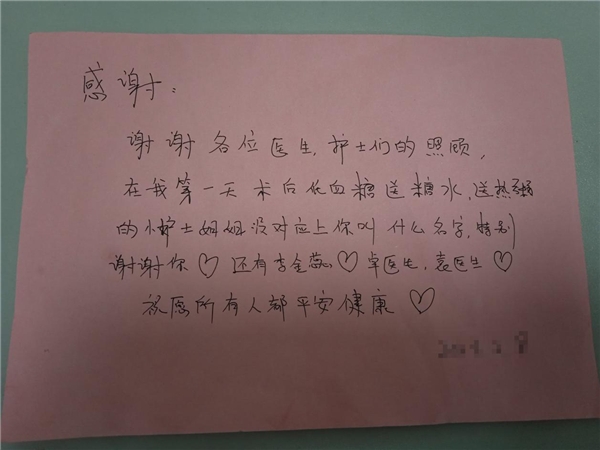 “謝謝各位醫(yī)生、護(hù)士們的照顧,在我第一天術(shù)后低血糖送糖水、送熱粥的護(hù)士小姐姐沒對應(yīng)上你叫什么名字,特別謝謝你?(^_-)還有李全蕊、卓醫(yī)生、袁醫(yī)生。祝愿所有人都平安健康!”