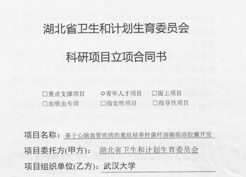 項(xiàng)目名稱:基于心腦血管疾病的重組枯草桿菌纖溶酶腸溶膠囊開發(fā)項(xiàng)目委托方