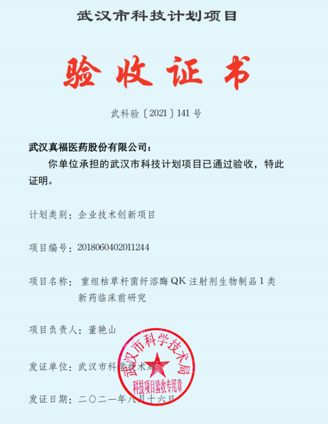 武漢真福醫(yī)藥股份有限公司:你單位承擔(dān)的武漢市科技計(jì)劃項(xiàng)目已通過驗(yàn)收,特此證明。