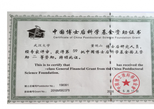 作為湖北真福醫(yī)藥研發(fā)團(tuán)隊(duì)人員之一的董艷山,獲此殊榮。武漢大學(xué)董艷山博士后研究人員,經(jīng)專家評(píng)審,活動(dòng)第59批中國(guó)博士后科學(xué)基金面上資助二等資助。特頒發(fā)此證。