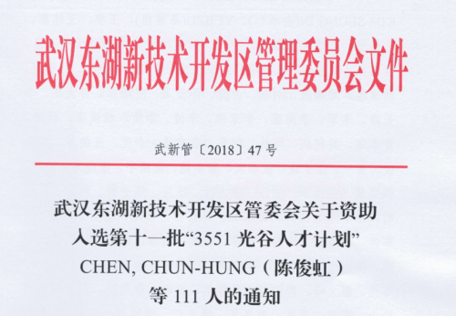 武漢東湖新技術(shù)開發(fā)區(qū)管委會(huì)關(guān)于資助入選第十一批“3551光谷人才計(jì)劃”CHEN,CHUN-HUNG(陳俊虹)等111人的通知。作為湖北真福醫(yī)藥研發(fā)團(tuán)隊(duì)人員之一的董艷山獲得資助入選計(jì)劃。