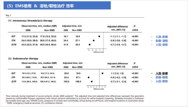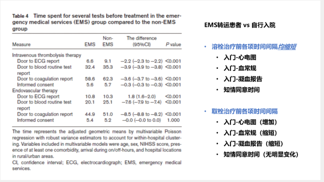 在考慮了潛在的混雜變量和醫(yī)院內(nèi)的相關(guān)性后,EMS的使用與更早的成像和更快速的組織型纖溶酶原激活劑給藥相關(guān)。當(dāng)按地區(qū)和到達(dá)時間進(jìn)行分層時,在城市和到達(dá)時間的分層中,DIT、ITN和DTN時間的減少幅度更大。EMS組從住院到接受心電圖檢查、血常規(guī)檢查、凝血試驗(yàn)和知情同意書的時間均顯著縮短。(表2)