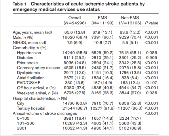 共納入24296例AIS患者。平均年齡為66歲(SD13歲), 其中68%為男性。NIHSS基線平均評分為7.9分(SD為6.9) 。大多數(shù)(77%)患有一種或多種與血管相關(guān)的共病(表1 )。EMS組和非EMS組分別有11190例(46%)患者和13106例(54%)患者。EMS組的患者年齡較大,女性更多發(fā),病情更嚴(yán)重,更可能有共病,更有可能在非工作時間到達(dá)醫(yī)院。此外,EMS組的患者也更有可能在三級醫(yī)院、城市醫(yī)院接受治療。