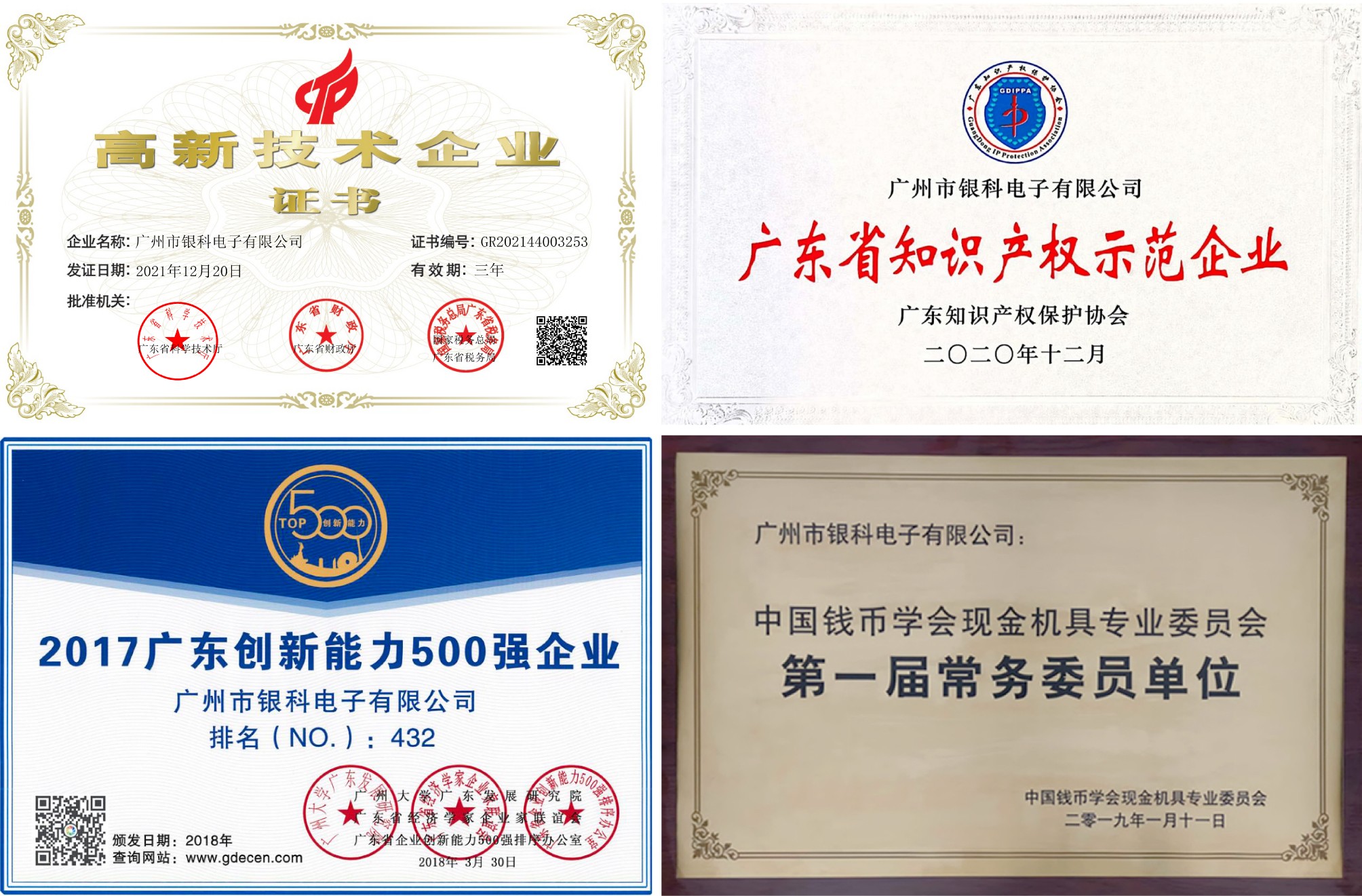 憑借突出的技術(shù)創(chuàng)新能力,銀科2018年入選為“廣東企業(yè)創(chuàng)新能力500強(qiáng)企業(yè)”、“瞪羚企業(yè)”,同年當(dāng)選為中國人民銀行直屬的“中國錢幣學(xué)會(huì)現(xiàn)金機(jī)具專業(yè)委員會(huì)”常務(wù)委員單位,公司董事長當(dāng)選為“中國錢幣學(xué)會(huì)現(xiàn)金機(jī)具專業(yè)委員會(huì)”第 一屆專家委員。2020年公司榮獲“廣東省知識產(chǎn)權(quán)示范企業(yè)”。