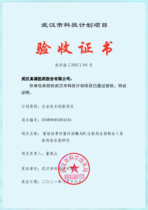 你單位承擔的武漢市科技計劃項目已通過驗收,特此證明。