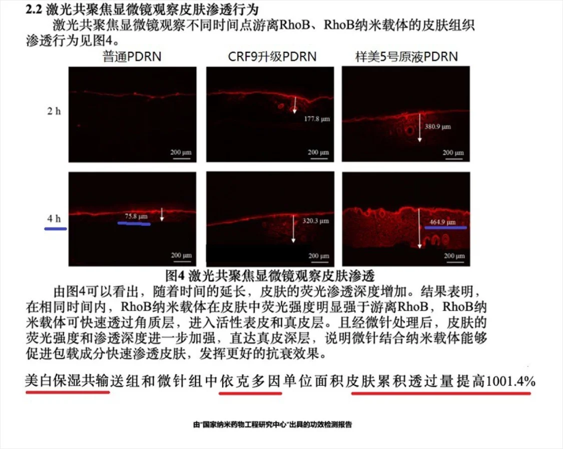 從我國權(quán) 威機構(gòu)的實驗檢測結(jié)果上可以看到,使用4小時以后,普通的三文魚原料滲透只有75微米大概在淺皮層,而被CRF9技術(shù)平臺升級過的PDRN可以深達(dá)464微米,直接進(jìn)入了真皮深層,深入到細(xì)胞內(nèi)。