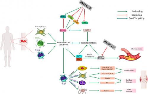 蜂膠具有強(qiáng)大的抗炎活性。它降低了iNOS的基因表達(dá)、NF-κB活化介導(dǎo)的細(xì)胞因子以及T細(xì)胞中的免疫反應(yīng)。同樣如先前的研究所示,蜂膠成分可能直接調(diào)節(jié)基本免疫細(xì)胞功能。例如,在脂多糖刺激的類(lèi)風(fēng)濕關(guān)節(jié)炎W264.7巨噬細(xì)胞中,從蜂膠中提取的異黃酮類(lèi)新維斯特醇通過(guò)抑制NO產(chǎn)生和降低促炎細(xì)胞因子水平顯示出免疫調(diào)節(jié)作用。蜂膠提取物和蜂膠化合物可以抑制Th1和Th2中DNA合成和炎性細(xì)胞因子的產(chǎn)生型T細(xì)胞,同時(shí)增強(qiáng)轉(zhuǎn)化生長(zhǎng)因子-β1的產(chǎn)生。此外,已提出抑制巨噬細(xì)胞活化和分化是引起蜂膠抗炎和免疫益處的可能機(jī)制之一。