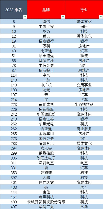 圖中為2023年中國品牌價值500強(qiáng)中39個上榜的深圳品牌