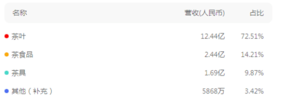 2022年,天福集團茶葉、茶具、茶食品的營業(yè)收入占比更是高達96.59%。其中,茶葉營收12.44億元,占比72.51%;茶食品營收2.44億元,占比14.21%;茶具營收1.69億元,占比9.87%。