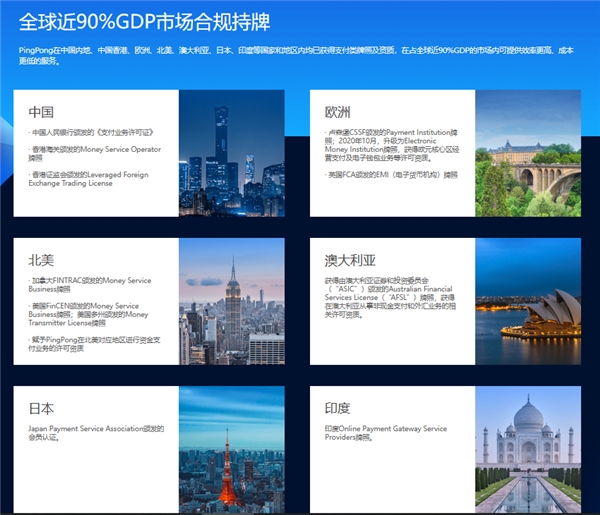 不僅如此,為讓廣大中小外貿(mào)企業(yè)“安全收付,放心收付”,PingPong福貿(mào)在拓展其全球收付服務(wù)網(wǎng)絡(luò)布局的同時(shí),還不斷加強(qiáng)其資金收付安全合規(guī)體系的建設(shè)。目前,PingPong福貿(mào)通過不斷爭取全球主要經(jīng)濟(jì)體國家及地區(qū)的支付牌照及認(rèn)證資質(zhì),已成為國內(nèi)為數(shù)不多同時(shí)擁有中國內(nèi)地、中國香港、歐洲、美國、日本等主要經(jīng)濟(jì)體支付類牌照及資質(zhì)的雙邊合規(guī)企業(yè),并擁有含金量極高的盧森堡 EMI 牌照,用實(shí)力為企業(yè)的每一筆資金保駕護(hù)航。
