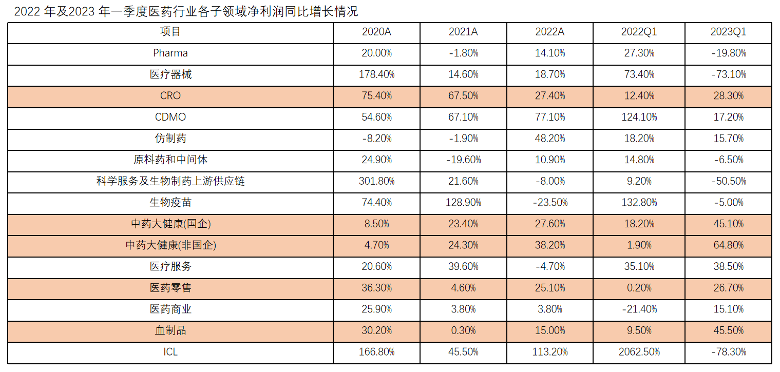 第 一個數(shù)據(jù)是根據(jù)醫(yī)藥企業(yè)上市公司的年報數(shù)據(jù)做出的統(tǒng)計,可以看到在醫(yī)藥行業(yè)的細分產業(yè)里,CRO和醫(yī)藥零售的數(shù)據(jù)表現(xiàn)明顯是要好過于其他領域,在上游研發(fā)和下游銷售都有較好表現(xiàn)的情況下,制藥回暖是有較大支撐的。不同于其他行業(yè),制藥上下游的增長能帶動中游,而非中游制藥的不景氣拖累上下游。