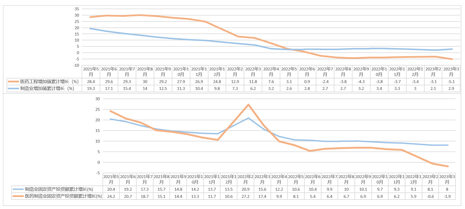 一個不得不接受的事實是制藥廠房的建設及整個制藥行業(yè),在過去的一年里發(fā)生了前所未有的大滑坡。從國家統(tǒng)計局公布的數(shù)據(jù)來看,醫(yī)藥制造業(yè)的累計增加值和固定資產投資累計增長這兩個數(shù)值早在2022年的5月左右就已經(jīng)低于制造業(yè)平均水平。