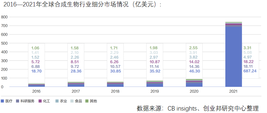 去年開始,行業(yè)的各個論壇、講座都已經(jīng)開始把合成生物學這個概念拿出來講了,足以體現(xiàn)大家對此的關注度。在2021年開始,合成生物學市場規(guī)模暴增的點,是在于醫(yī)療領域,這里的醫(yī)療包含制藥。