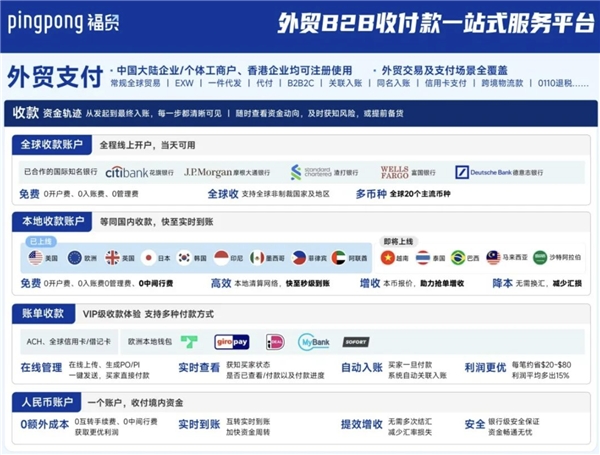 在支持「服務(wù)貿(mào)易」企業(yè)合規(guī)收款的同時,PingPong福貿(mào)還開放了付款、結(jié)匯以及多方位的資金管理能力,形成了一個完整的多場景收款方解決方案。在收款方面,福貿(mào)與包括花旗、摩根大通在內(nèi)的各大國際知名銀行合作,在17大全球收款賬戶外,還提供了9個本地收款賬戶。其中,本地收款賬戶支持按本地幣種清算,快至秒級到賬,無須任何中間行費(fèi)用,幫助買賣雙方一同降本增利。