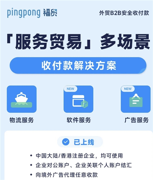PingPong福貿(mào)「服務(wù)貿(mào)易」還一次性支持了服務(wù)貿(mào)易中的物流服務(wù)、廣告服務(wù)、軟件服務(wù)等3大主要場景。