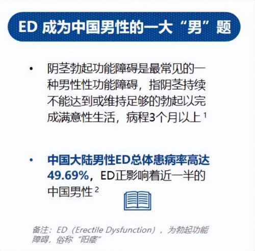 數(shù)據(jù)表明,超過四成男性存在健康問題和困擾,其中性健康問題更是當(dāng)代男性的三大困擾之一。值得注意的是,勃 起功能障礙(Erectile Dysfunction,簡稱ED)作為最常見的性 健康問題,由于沒有得到科學(xué)規(guī)范的及時治療,正在不斷威脅廣大男性的健康,并進(jìn)一步給家庭生活和社會經(jīng)濟(jì)造成負(fù)擔(dān)。
