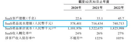 對(duì)比客戶增長(zhǎng)情況,銷售額的增長(zhǎng)困境更加凸顯。2022年比2021年客戶數(shù)增長(zhǎng)了1.26萬(wàn)名,同比增長(zhǎng)38.1%,但同期SaaS產(chǎn)品流水總額僅增加了2427.9萬(wàn),增長(zhǎng)3.3%。